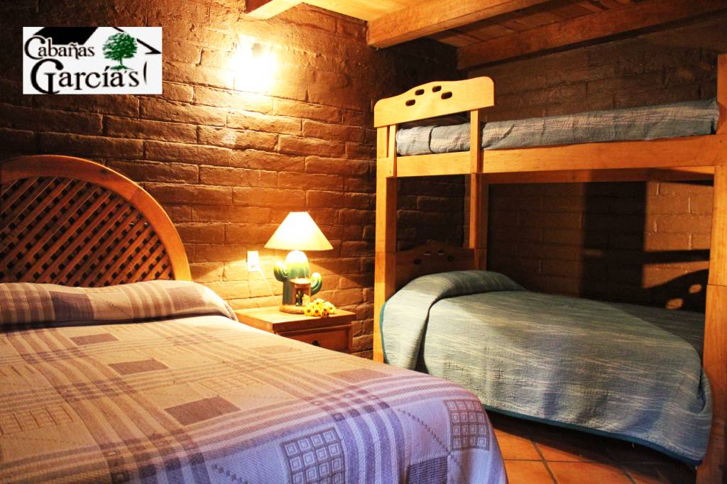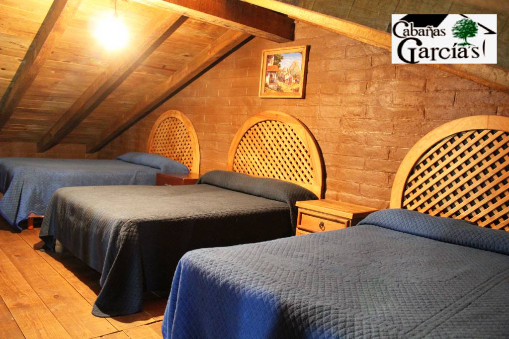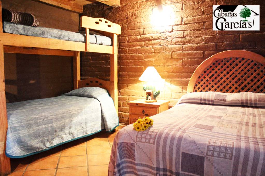 La cabaña cuenta con dos recamaras en planta baja con una cama matrimonial y una litera en cada una. En una segunda planta tipo tampoco contamos con tres camas matrimoniales.